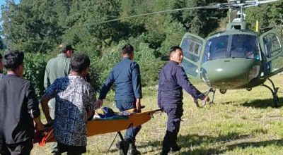 काठमाडाैं । सुत्केरी हुने क्रममा स्वास्थ्य अवस्था जटिल भएपछि सङ्खुवासभाको मकालु गाउँपालिका–३ की २९ वर्षीया सीता तामाङको हवाई उद्धार गरिएको छ । पाथिभरा स्वास्थ्य चौकीमा सुत्केरी हुन पुगेकी उनीको स्वास्थ्य अवस्था जटिल भएपछि आज विहान नेपाली सेनाको हेलिकप्टर मार्फत् विराटनगरस्थित कोशी अस्पतालमा लगिएको हो ।